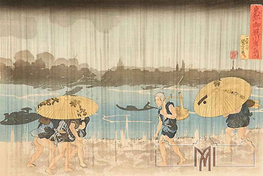 Kuniyoshi Utagawa (1797 - 1861), Japonia, sec. XIX, Ploaie. Hartie, xilogravura, 34,4 x 24,5 cm