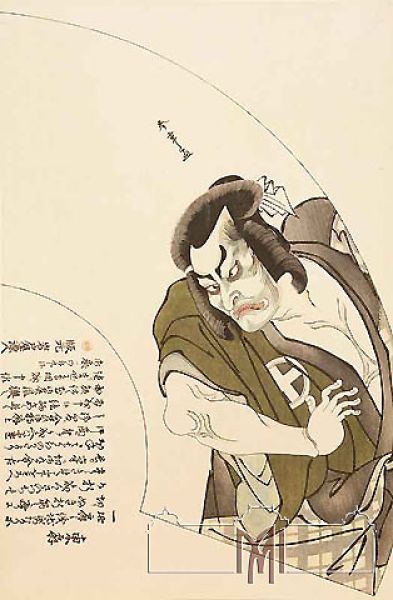 Katsukawa Shunsho (1726-1792), Japonia, Evantai cu imaginea unui actor. Hartie, xilogravura, 37,7x24,9 cm