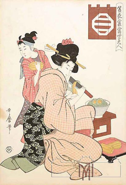 Kitagawa Utamaro (1753-1806), Japonia, Pregătirea dovleceilor. Hârtie, xilogravură, 36,5 x 25,4 cm
