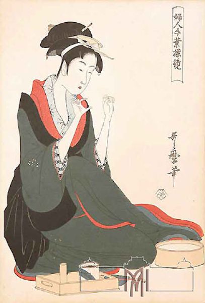 Kitagawa Utamaro (1753-1806), Japonia, Femeie cu fir de matase. Hartie, xilogravura, 37,0 x 25,4 cm